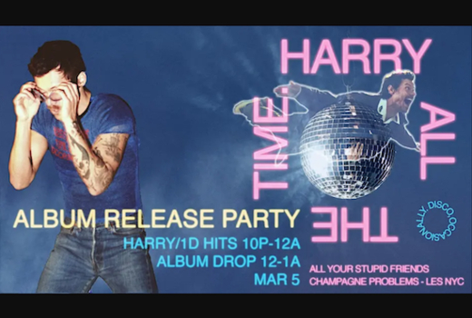 Get ready for a night of Harry and 1D classics at Harry's house party! Groove to the tunes and countdown to the release of Kiss All The Time at midnight. With a special projector for new video drops, the party is co-hosted and DJ'd by All Your Stupid Friends and DJ Ari Baby.