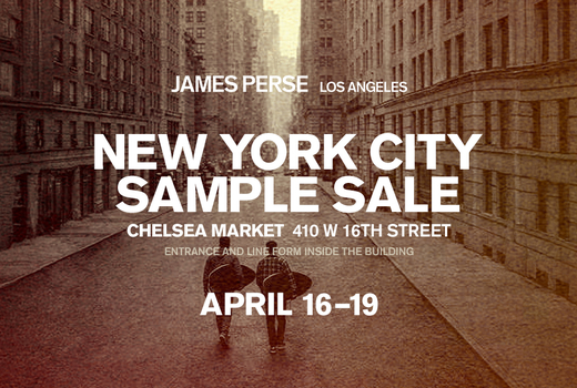 Don’t miss the James Perse NYC Sample Sale at Chelsea Market, April 16–19! Shop men’s and women’s apparel and accessories at exclusive sample sale pricing for a limited time. Sign up for Early Access and shop the best selection before the crowds with priority entry from 8:00am–10:00am on Thursday and Friday. Plus, enjoy free coffee & drinks!