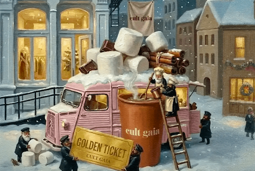 Join Cult Gaia at their New York store for complimentary hot chocolate—some cups carrying a whisper of gold at the bottom—and try your luck outside by finding a golden ticket on your cup to unlock a surprise inside the store, where 5 winners will receive an eau de parfum of their choice (Zan, Noor, or Mast) along with a travertine vessel and candle, 5 winners will take home a Backgammon clutch and playing cards, 4 winners will receive the Mercier mini shoulder bag in Bauble Multi, and 1 lucky winner will walk away with a $1,000 gift card.