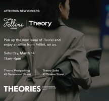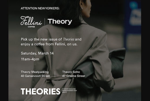 Join Theory as they celebrate the launch of Issue 2 of the brand’s magazine, Theories. The event will take place at both Theory Meatpacking and Theory SoHo, where they’ll be partnering with iconic NYC coffee house Fellini to toast the Spring/Summer issue. Guests can enjoy complimentary copies of the magazine along with freshly brewed coffees from Fellini throughout the day.