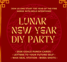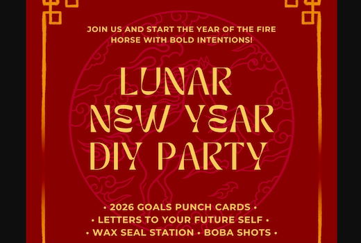Welcome the Lunar New Year with an intimate, hands-on gathering inspired by the Year of the Fire Horse — a symbol of momentum, courage, and new beginnings. Guests will write letters to their future selves and turn their goals into punch cards alongside artist in residence, sealing their intentions at their wax seal station. Your ticket also includes one complimentary boba shot and access to happy hour pricing on drinks and food (this includes delicious mocktails of some of their signature cocktails like the Szechuan Mala!)