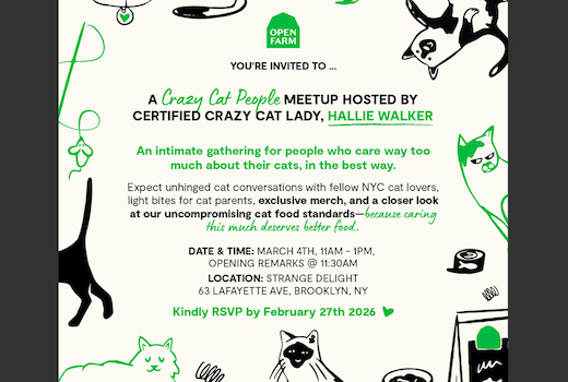 To reclaim the dated “Crazy Cat Lady” trope, Open Farm is ushering in a new era of cat parents who are stylish, informed, intentional, and unapologetic about their standards. Join for a fun in-person event hosted by Hallie Walker that brings cat people together and captures real confessions, rituals, and opinions. Enjoy light bites, exclusive merch, and take-home goodies, plus insights into Open Farm’s sourcing standards.