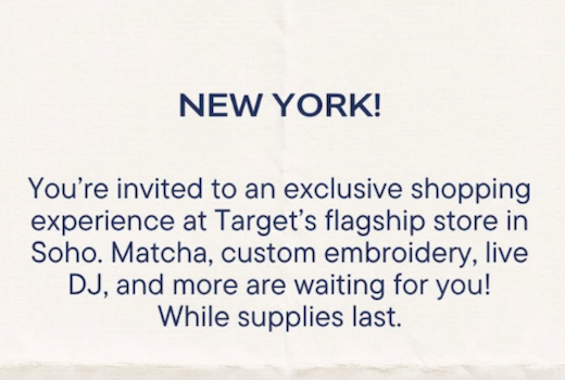 New York! You are invited to an exclusive shopping experience at Target’s flagship store in Soho! Celebrate the launch of the Parke for Target collection with Match, custom embroidery, live DJ and more!