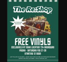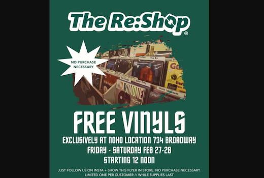 This Friday–Saturday (Feb 27–28) starting at 12PM, they’re doing a FREE vinyl giveaway at the Reshop NoHo store! One vinyl per person! It’s a mystery pick, you don’t get to choose. While supplies last. No purchase needed. All you have to do is follow them on Instagram and show the flyer below at the register.