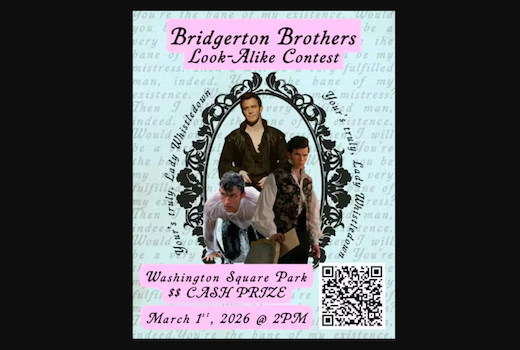 Your ever-watchful author is delighted to report that the Ton shall soon be treated to a most extraordinary spectacle: a look-alike contest honoring the illustrious Bridgerton brothers—Anthony Bridgerton, Colin Bridgerton, and Benedict Bridgerton—the season’s most coveted gentlemen. Admirers bold enough to embody their charm and presence are invited to present themselves at Washington Square Park on March 1, 2026 at 2 PM, where society shall determine who best captures the spirit of a true Bridgerton, with a cash prize awarded to the chosen favorite; those confident in their claim to be the season’s true catch may submit their name via the Google Form above and prepare for the stir that is sure to follow.