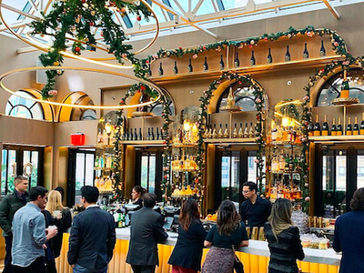 communal bar area. Twenty-five stories up near Bryant Park sits the lavish Elsie Rooftop paying homage to society's doyenne. Bringing storied events all the way from Paris and London halfway across the world to New York City’s energy and savoir faire. Offering progressive mixology and an upscale seasonally focused light fare menu, which perfectly compliments every cocktail. Located on the 25th floor penthouse — Elsie is truly an all-season destination with stylish indoor and outdoor seating options.