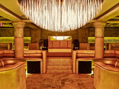 Gilded Lily is a subterranean lounge located at 408 West 15th Street. A street-side industrial elevator brings guests downstairs to the underground room designed by Roman & Williams, which features a glass-like floor created from gold glitter flakes and a sunken dance floor, surrounded by plush gold seating at the center of the room, heralded above by a striking LED chandelier.
