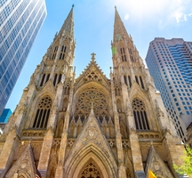 St. Patrick's Cathedral is a Catholic cathedral in the Midtown Manhattan neighborhood of New York City. It is the seat of the Archbishop of New York as well as a parish church. The cathedral occupies a city block bounded by Fifth Avenue, Madison Avenue, 50th Street, and 51st Street, directly across from Rockefeller Center. Designed by James Renwick Jr., it is the largest Gothic Revival Catholic cathedral in North America.