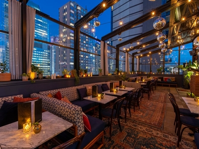 Perched 27 stories high, Starchild Rooftop offers an elevated lounge experience with exceptional views. Its retractable roof transforms the venue from a climatized, glass-enclosed space to an open-air rooftop in seconds. Outdoor terraces offer panoramic views of the city skyline, and the custom Funktion-One sound system creates a uniquely sensory, immersive experience. The perfect place to take in sunset views and unwind, Starchild offers cocktails and bites to post- rk patrons, theater-goers, locals and happy hour guests. On weekends, legendary international DJs and emerging artists alike conduct soundtracks of classic house, funk, soul and disco."