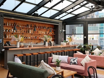 The Glass Ceiling is just that, a beautiful retractable glass ceiling sitting atop the city skyline. A brand new rooftop lounge located in the heart of Nomad. The design adds a glamorous touch to the botanical theme, with a marble bar, concrete surfaces and rattan accents. The space is multi-dimensional transforming daily from a communal workspace to a lounge with light bites and cocktails to an intimate, curated events space. Featuring indoor and outdoor seating, show-stopping views of the Empire State Building, and an escape from your everyday urban routine.