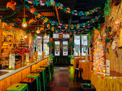 The space that channels the edginess of 80’s NYC. Designed by Jason Volenec of Volenec Studio (Bodega Negra, Miss Lily’s, Butterfly), the 50-seat space incorporates raw, nostalgic elements meant to evoke the bygone era - think a black and silver checkerboard ceiling and original flyers from punk and hip-hop shows and a beautiful piece by the famed artist of that era, Maripol, featuring Polaroids of Basquiat in his downtown NYC loft in 1982.