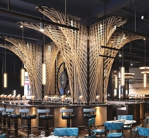 Inside, the design is pure spectacle. The curved, 44-seat cocktail bar known as Aqua Spirit makes an immediate impression, crowned by a massive hemp-rope sculpture and a sound system built for high-impact ambiance. Nearby, jewel-toned mezzanine booths overlook the dining rooms, offering the perfect perch for an indulgent omakase or truffle-dusted pasta.
