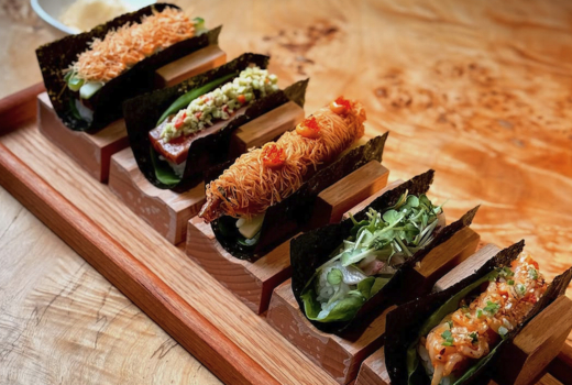 Take your pick of the delectable temaki, be it the Spicy MC Low with tuna, chili, sweet soy sauce, and spicy mayo, not to mention the AB Crunchy, aka kataifi-fried shrimp with tobiko roe, and the Hamachi repping ume plum & shiso guacamole, just to name a few.