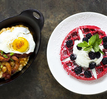 Why choose between sweet & savory, breakfast & lunch, main & dessert, when you can have it all? Start with an Egg Baked Casserole (bell pepper, salami, ham, mushrooms, cheese) and move on to the Belgian Waffle. Or go for the Steak & Eggs, a phenomenal pick to satisfy even the heartiest appetite.