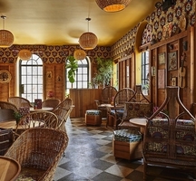 Its New York incarnation was designed by Roman and Williams, who warmed up the vast, 18th floor space with wicker chairs, raw wood panels, Penguin Foot ceramics and eclectic plants by UrbanGreen. The result - comprising 2 bars each, indoors and out - is cozy and exotic, like being invited to a house party...if the hosts are well-traveled expats based in the Seychelles.
