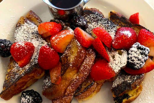 Standouts include Cranberry Walnut Pancakes comprised of a citrus batter, poppy seed, candied walnuts, orange zest, and cranberry cabernet compote, as well as the Pizza for Breakfast studded with poached eggs, bacon, mozzarella, sautéed spinach, and sour cream, and lest we forget, Caraway Chicken Schnitzel with a crispy caraway crust, baby red oak, vinaigrette, and sun-dried tomato aioli.