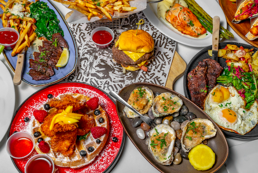 Slice into Steak & Eggs, or surrender to sweet sensations of French Toast topped with blueberries & a scoop of vanilla ice cream and caramel, or Strawberries & Cream Pancakes layered with marinated strawberries, sweet condensed milk, and chantilly cream. The Chicken + Waffles are another delight, with a cheddar cheese & Maduros-crusted waffle under golden crispy chicken bites, drizzled in Thai sweet chili maple glaze.