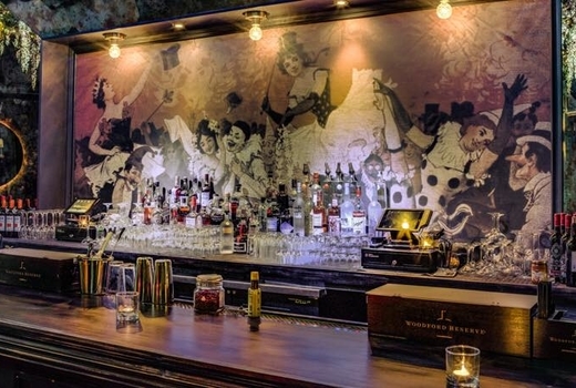 The spacious, 2,000-square foot speakeasy is made cozy using intimate vignettes, with old books, cheeky neons, a fireplace, and feather fans serving as focal points. A highlight is the Lautrec-style mural behind the bar, depicting a Belle Epoque show of cancan dancers, clowns, and other denizens of the night.