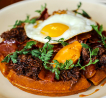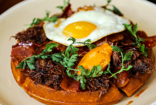 As you tipple from glass after glass of refreshing Mimosas (both classic and with a fresh hibiscus infusion), you will slice into Beef Short Rib & Waffle (bacon, fried egg, hot honey), or drool at the behemoth that is the La Burger piled high with 4-ounce Pat LaFrieda patty, charred onions, pickled jalapeño, Oaxaca cheese, and spicy aioli.
