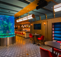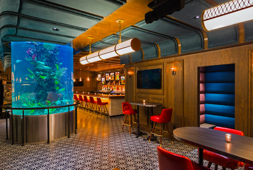 Welcome to Fishbowl, where Midtown Manhattan meets upscale game room. Upon entering the 2,500 square foot venue, guests descend a grandiose gold spiral staircase where they are greeted by a 5,000-gallon fish tank, home to over 150 exotic saltwater fish, and a large exposed brick bar.