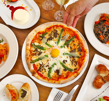 The Wood-Fired Frittata is bursting with heirloom tomatoes, arugula, taleggio, and parmesan; while the Bacon, Egg & Cheese Pizza gets a gourmet touch of creamy burrata and grape jelly.