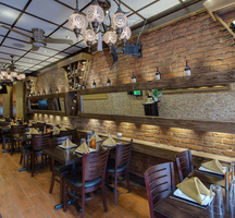 Exposed brick and rich hues of dark woods and soft lighting are accented by flashes of gold, nodding to the vibrant culture of its cuisine with elegance and style.