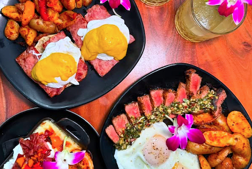 Imbibe decadently, taking a break to dive into decadent creations: the juicy Steak & Eggs with chimichurri sauce and roasted potatoes, or indulge in the French Toast Mezcal, aka Grand Marnier-battered toast topped with toasted almonds, mixed fruit, cinnamon-infused agave, and mezcal whipped cream.