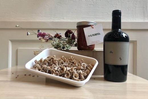 The Puttanesca sauce included in your kit will be poured over handmade Campanelle Pasta, shaped like a cone with a ruffled edge, or a bell-like flower and best enjoyed alongside a fabulous bottle of Piedresassi Syrah Wine, carefully chosen to balance the flavors of each bite.