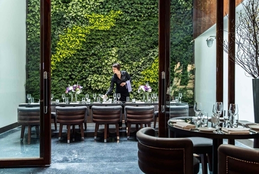 The gorgeous dining room, with its floor-to-ceiling windows that open out to the sidewalk, adds to the quintessential Italian atmosphere of easy elegance, or leggerezza. White marble, warm wood panels, and a lush vertical garden exude a sophisticated yet welcoming vibe.