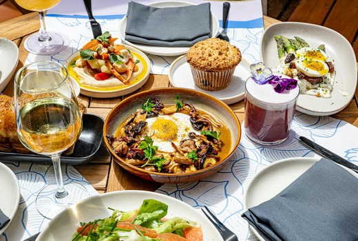 Step into a space where sunlight pours through floor-to-ceiling windows, illuminating contemporary design, warm wood accents, and lush touches of greenery. The scene is set for brunch bliss, whether you're nestled inside or dining al fresco on the stunning patio & people watching, surrounded by summer energy and ultra-cool city dwellers.
