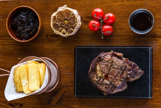 The 12oz Rib Eye Steak comes with Portabello mushrooms, overnight tomato confit, triple cooked French Fries and your choice of sauce (the peppercorn is most delightful).