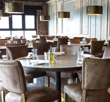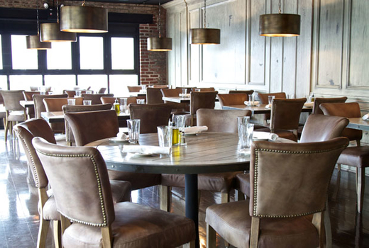 The rustic and upscale feel of the menu is reflected in the effortlessly graceful dining room, with round unfinished-wood tables, a marble bar, toffee leather chairs and antique-brass pendants.