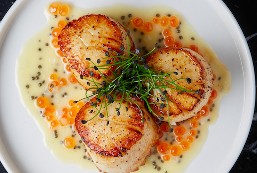 Slip into cocktails like The Passersby's Paradise made with Grey Goose Vodka, Mumm Brut Champagne, raspberry, and thyme, before beginning with Day Boat Scallops, or the A5 Wagyu Beef Katsu Sando.