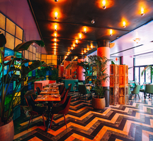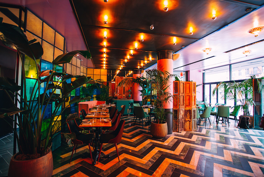 The space designed by Turjeman Jaakow is inspired by adventurer-writers like Hunter S. Thompson, George Plimpton, and Ernest Hemingway. Colorful glass partitions, splashes of tropical pink, gold, and green, flowering vines, and cabanas make fluid references to California cool and Barbadian beach shacks.