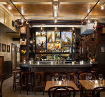 Inspired by the Colonial period, the cuisine and libations effect rustic luxury. Just as much attention is paid to the curved zinc bar, taxidermy animals, craftsman-style bookcases, vintage sideboards and a gorgeous, ebony-painted fireplace and mantlepiece.