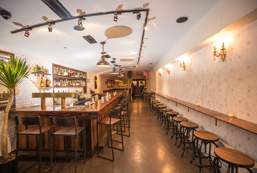 A refreshing Pimms Cup (Pimms No. 1, mint, fresh lime), luscious Sazerac (St. George absinthe, Sazerac rye, Cognac), or a chilled glass of wine will cool you off throughout this steamy setup studded in vintage sconces & pendant lamps that cast a sultry glow on the space.