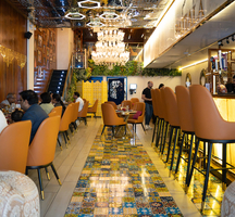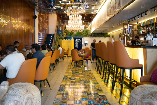 The interiors are an ode to the culture that is so full of flavor & heritage. Think gold laced throughout in an elegant mix, with hues of marigold, attention-grabbing turquoise banquettes, dramatic chandeliers, and pops of magenta immersing you in a wonderland that's just as jaw-dropping as the food itself.