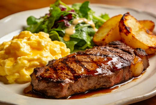• $5 upcharge for Steak & Eggs, Branzino, and Pollo.