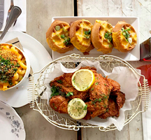 "Winner winner Chicken Dinner! But really. Go for the fried chicken and cheddar waffles. You will not regret it. We got the family style supper with the biscuits, chicken and waffles, deviled eggs, sides and delicious dessert. Absolutely worth it. Everything was amazing. Gorgeous."
