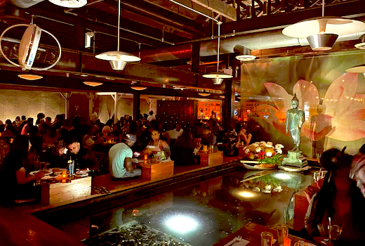 A giant Buddha overlooks a sparkling pool in the middle of the locale, awash in beautiful design elements that will make you feel as though you've landed in a luxe Thai resort. Sip on curates wines or savor sips like the Tropico with Hendrick's gin, pineapple, cucumber, & pear purée, getting your palate fired up in anticipation.
