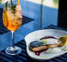 Think flaky, tender Salmon, pan-roasted with mushrooms, white bean mousse, wilted kale, and tomato gastrique, best heightened by a crisp white wine. The Lobster Roll is also a regular's favorite, overflowing with rich chilled lobster meat, horseradish aioli, and giardiniera.
