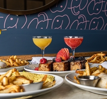 The food is lavish, to say the least. We're talking Churro Pancakes with cocoa-maple caramel and brûléed cinnamon sugar, Stuffed Caramel French Toast (maple-caramel stuffed brioche, fresh berries, strawberry powdered sugar), and the jaw-dropping WTF Waffle Sandwich comprised of a mac & cheese waffle, fried chicken, bacon, maple aioli, house-cut fries, and pickles - OMG is the only way to describe what awaits!