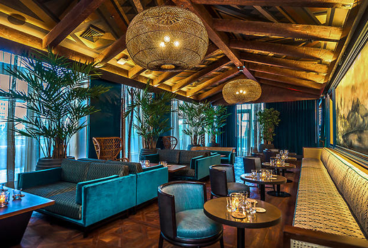 The Vanessa Guilford-designed decor surrounds you with rich turquoise and gleaming brass hues, evocative of a Tahitian retreat of a well-traveled midcentury mogul. As a reminder of where you really are, the wrap-around windows and a 100-seat outdoor deck look out onto the glittering city lights.