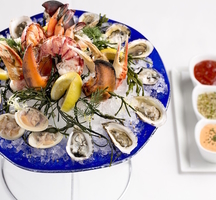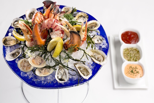 Think: a stacked Raw Bar (oysters, clams, shrimp, king crab), Pig Skin Potato Skins (potato skins, sliced pork belly, aged cheddar), Carnitas (corn tortilla, fixings), Dry Aged Beef Sliders, and the most upscale versions of your favorite American eats.