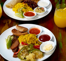 For brunch, you can't go wrong with New York City Breakfast (tofu scramble, peppers & onions, v-sausage, home fries, & buttered Ezekiel toast). Or try the mouthwatering Tofu Ranchero (toasted corn tortilla, scramble, beans, parmesan, salsa, avocado, & carne molida). Sweet Crepes with blueberries, banana & chocolate sauce is a refreshing yet decadent treat.